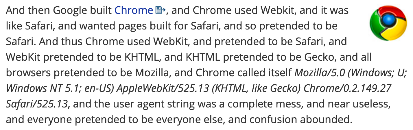 While working on our WebXR Viewer (XR focused iOS browser app), I made the mistake of finally looking seriously at the browser navigator.userAgent string, and asked my co-workers at Mozilla "WTH is up with that??!" (figuring someone would regale me with the history of how it evolved to where it is.
