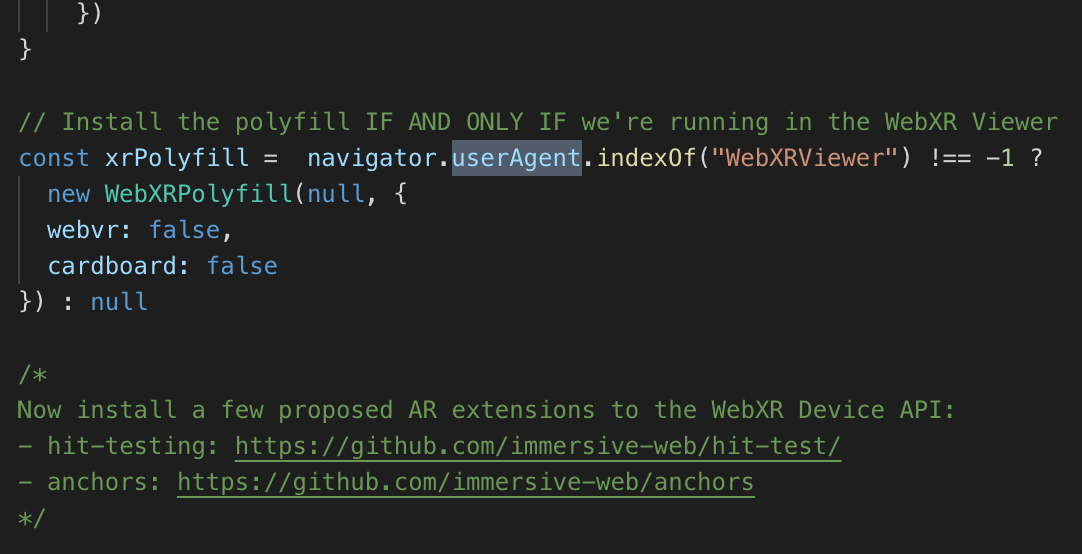 Manually loading the javascript for the browser's WebXR API this way will go away when the API is done, and automatically set up inside the browser, but for development and testing I wanted to be able to load it in my test programs, but have those also work elsewhere.