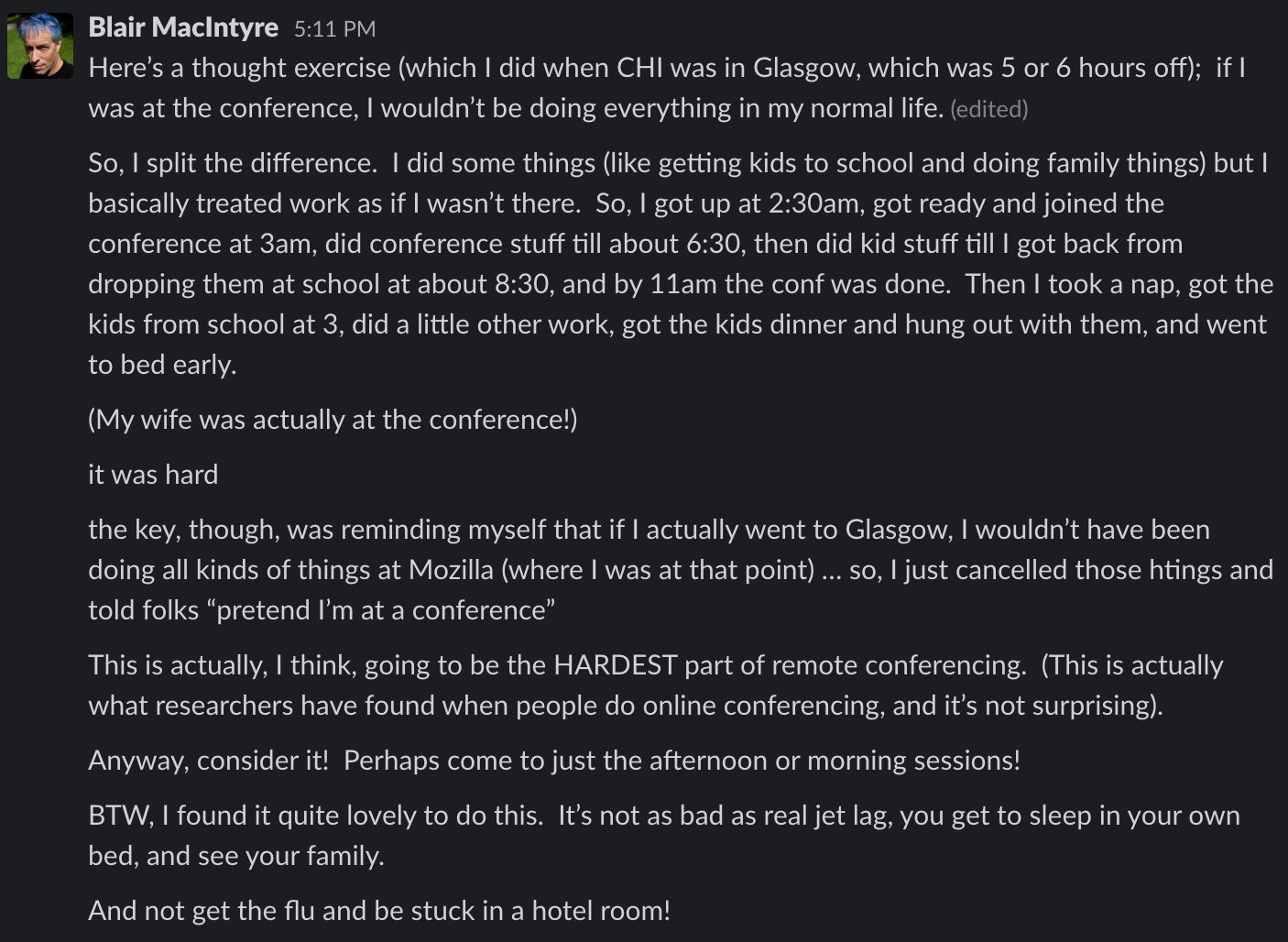 This is, of course, the biggest challenge with "remote attendance" at distant events. Here's what I wrote back, on our slack.