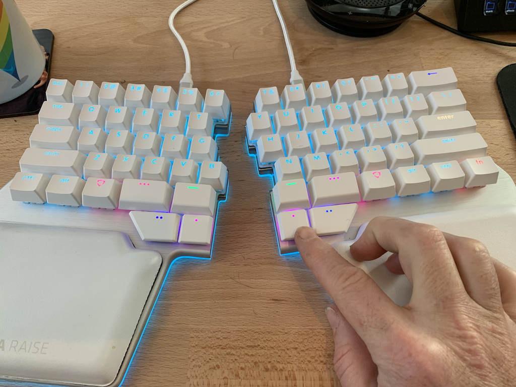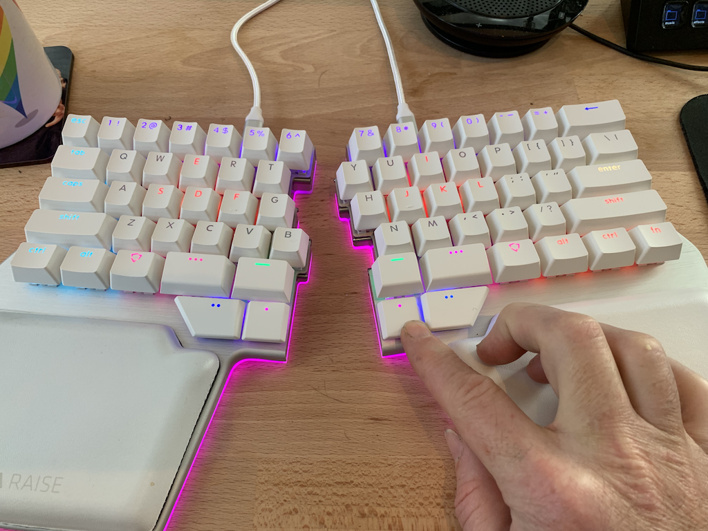 Overall, I'm happy with it so far, after just a half dozen more hours. I've mostly gotten used to hitting the lower right Escape key (the red Fn in the picture below), and the lack of tilt doesn't bother me too much (the split is by far more important). I like the compactness, so my mouse isn't so far off to the right.)