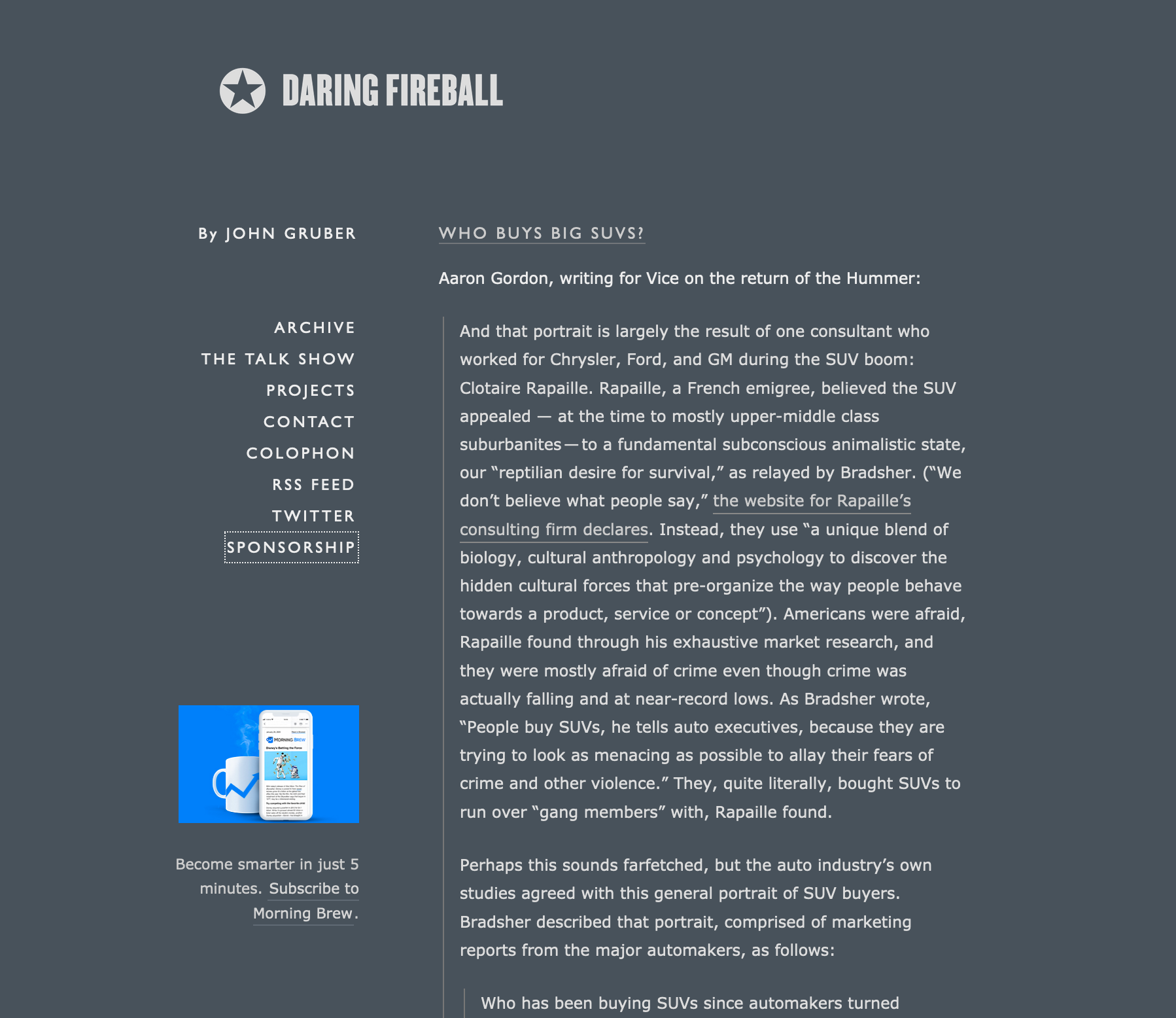 One of John Gruber's tweets over on Daring Fireball caught my eye, so I clicked through and saw his otherwise sparse site adorned with an ad for Morning Brew.