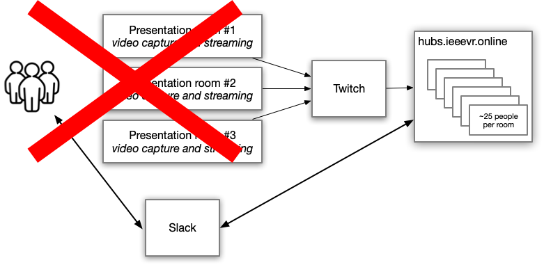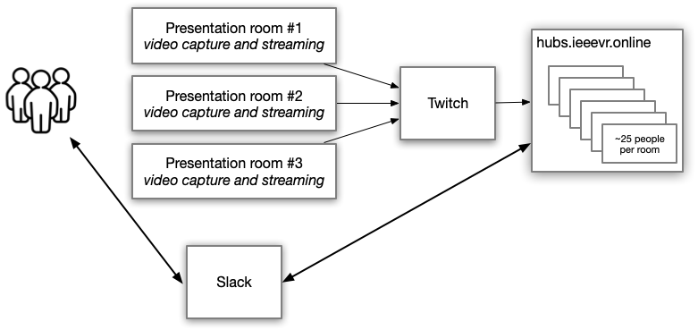 The setup would have been pretty simple: a collection of hubs rooms set up to view the three streams from VR2020's parallel sessions (that were being recorded and streamed to Twitch), and a Slack to let local and remote attendees chat if they wanted.