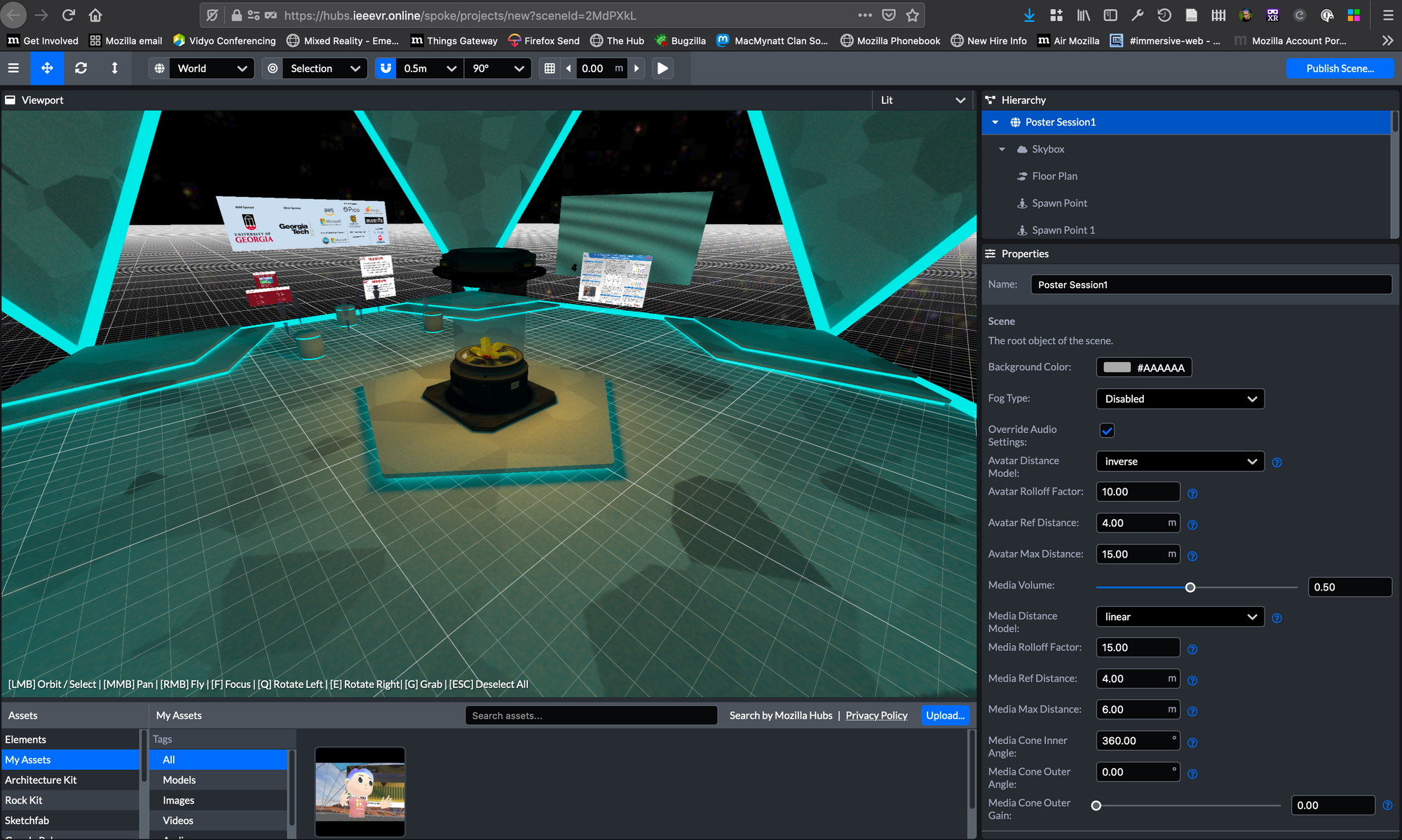 - Social spaces. We wanted people to be able to gather in slightly larger groups in each room than might be common in Hubs, since we anticipated conversations centered around a topic that many people would want to join in. Therefore, we wanted the sound to maintain full volume for a longer distance from each avatar than the Hubs default, and fall off faster than the default. We also wanted sound to carry more that the poster or presentation rooms, so the spaces felt busy and active.