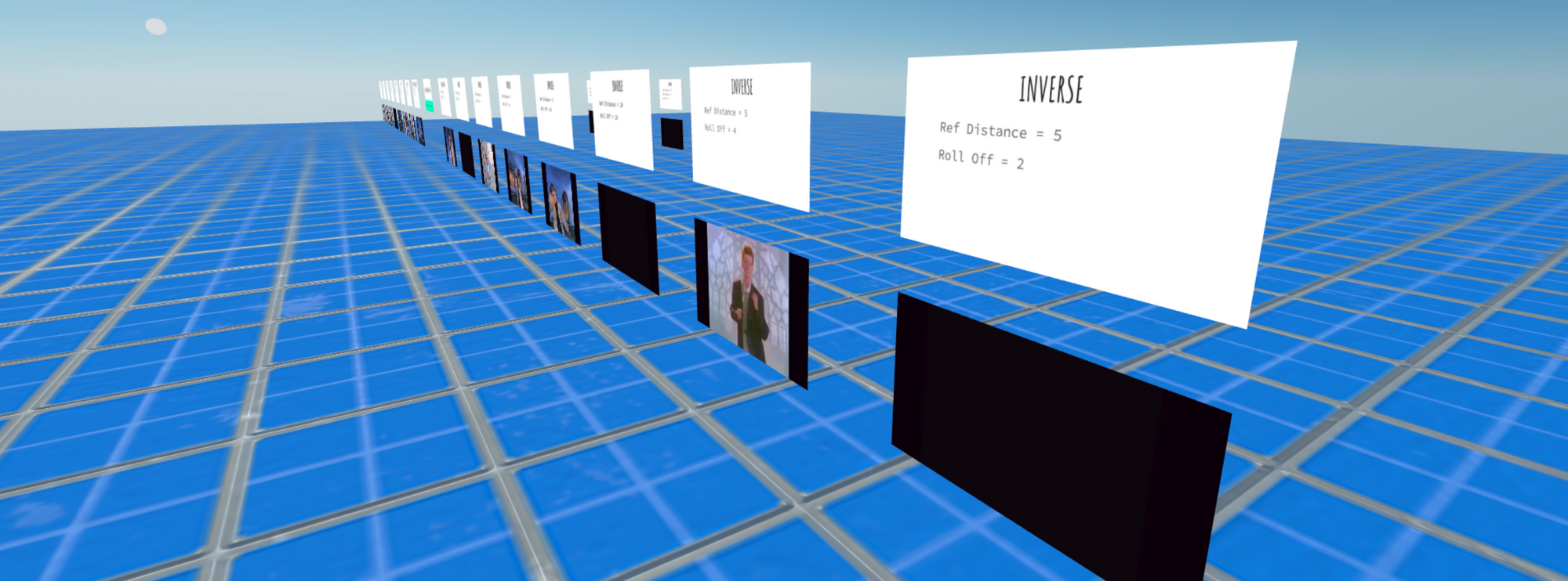Looking at this room in the Spoke scene editor, each of the small squares on the floor is half a meter; the distance between the posters is about 15 meters. In the audio settings for the scene (on the lower right in the image below), the two parameters that mater for the inverse model are the Avatar Rolloff Factor and the Avatar Reference Distance, which we ended up setting to 10 and 4.