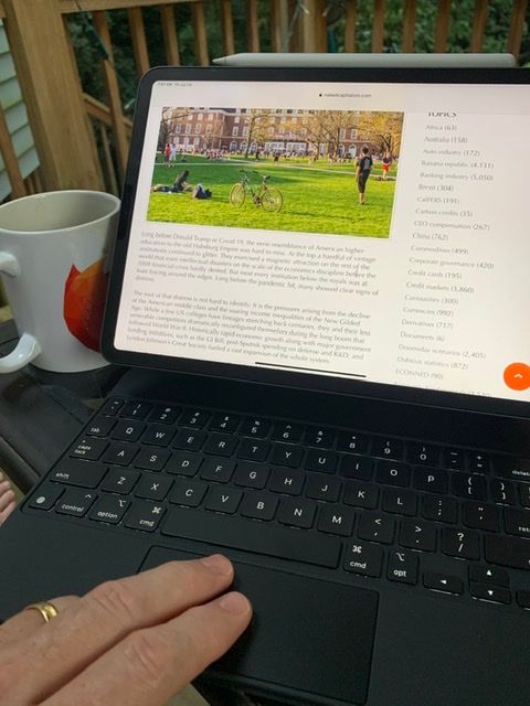 I decided to read some email and news on the back porch with the new keyboard setup, and I am happy to say it's like night and day compared to the previous setups I'd tried to use. The picture above is my scrolling through an article in Safari using two fingers on the trackpad; Ā being able to rest my wrist on the table and scroll (rather than hold up my whole arm like in the banner picture) is like night and day in terms of speed and comfort. Ā
